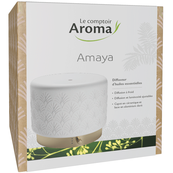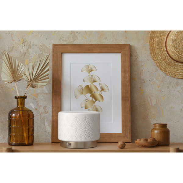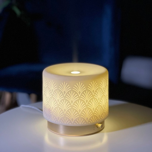 Le diffuseur d’huiles essentielles Amaya, au design inspiré des feuilles de Ginkgo et élaboré à partir de matériaux nobles (porcelaine et aluminium massif), s’adaptera facilement à tous les intérieurs.