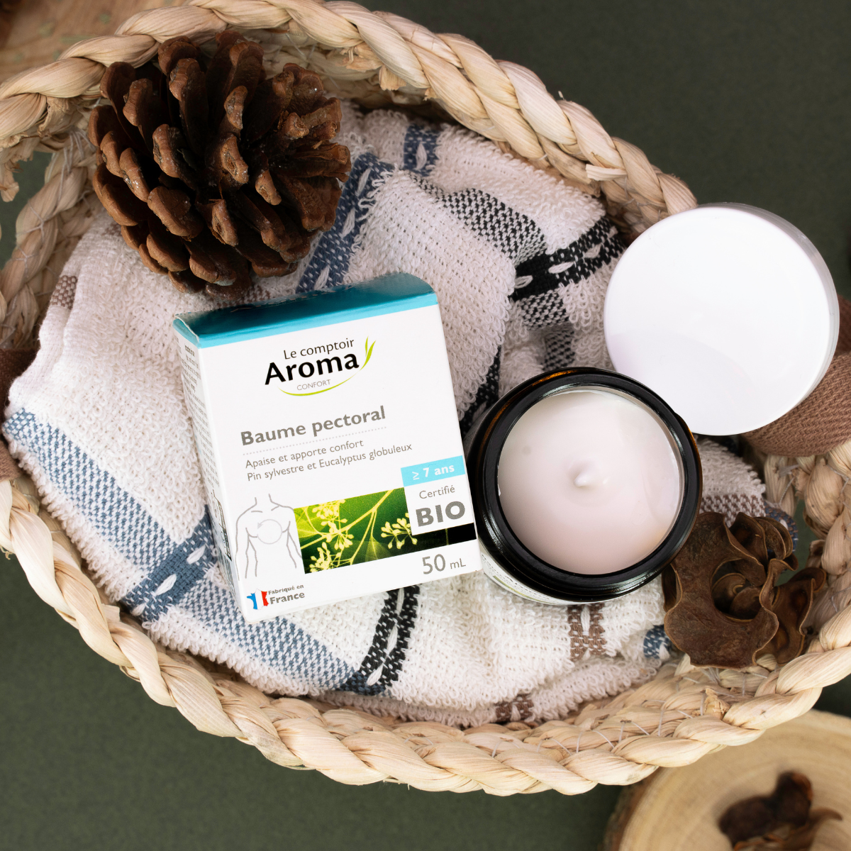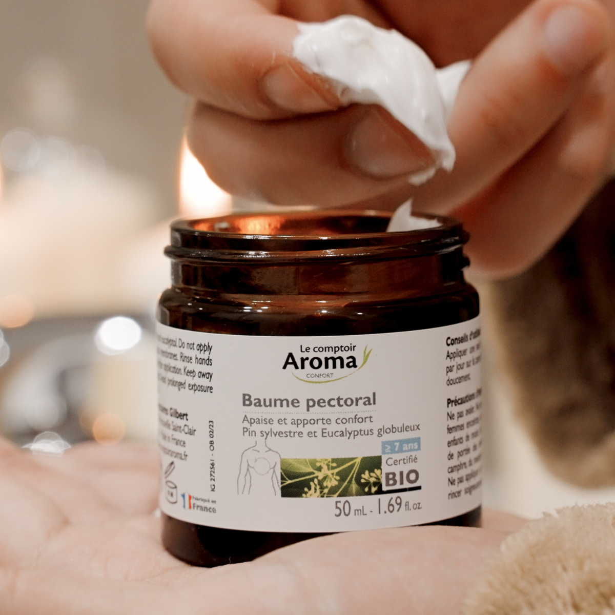 Par un massage en douceur, le Baume pectoral aux huiles essentielles Bio apaise et apporte