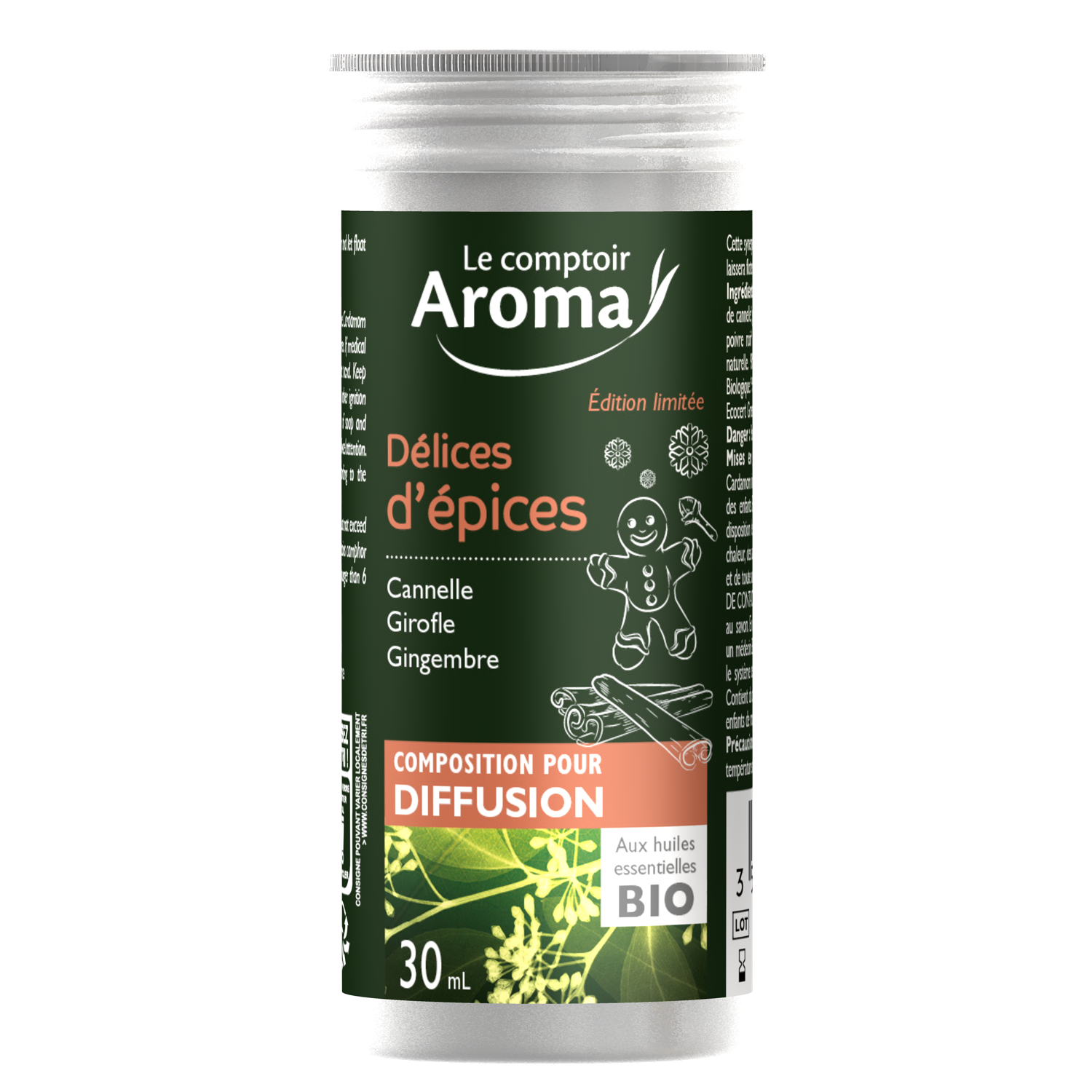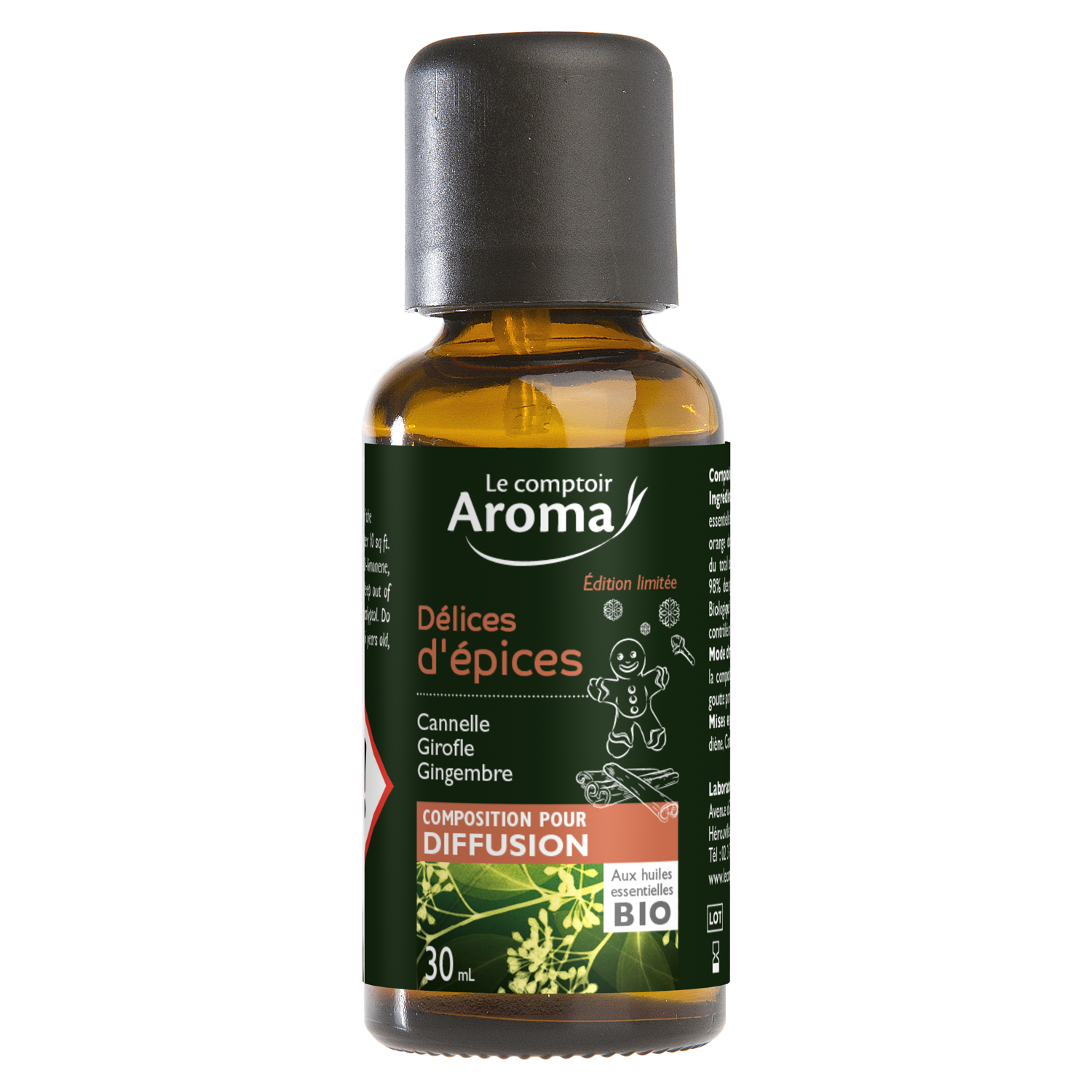 Huiles essentielles biologiques : Cannelle, girofle, gingembre, orange douce.