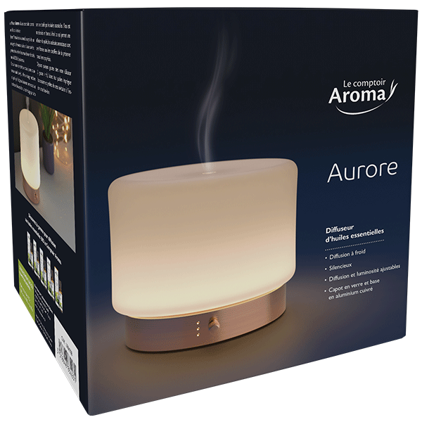 Le diffuseur Aurore d’huiles essentielles permet une diffusion discrète. Ajustez l’intensité de la luminosité au gré de vos envies grâce à la molette située sur la base cuivrée : profitez de la lumière chaleureuse du lever de soleil, telle l’AURORE du petit matin.
