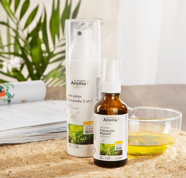 Huiles essentielles biologiques : Citronnelle, Lavande aspic, Menthe poivrée, Eucalyptus citronné, Bois de Cèdre et Géranium.